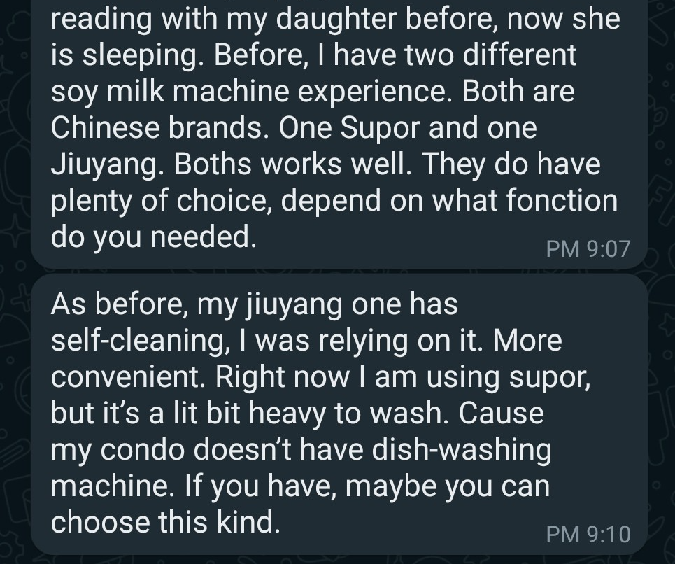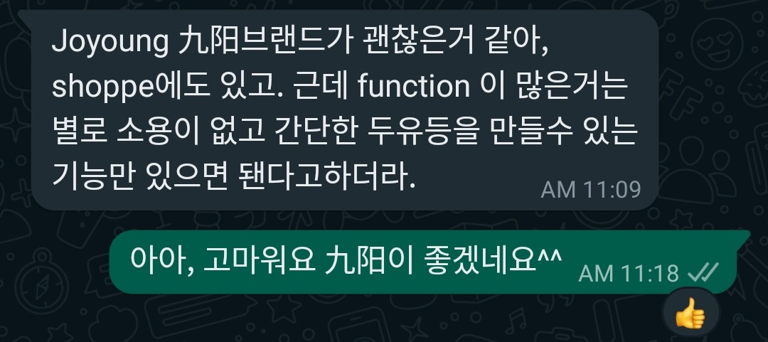 이런 게 있는 줄도 모르고 살 뻔했지 뭐예요. 하지만, 구매 전에 다른 중국인들은 어떤 두유 제조기를 선호하는지 알아봐야겠더라고요. 딸내미 학교에서 만난 중국인 엄마, 딸내미 유치원에서부터 알고 지낸 한국계 중국인(조선족이라고도 하죠)에게도 물어봤더니, 한결같이 Joyoung 제품이 좋다고 하네요.