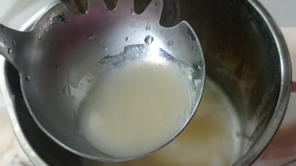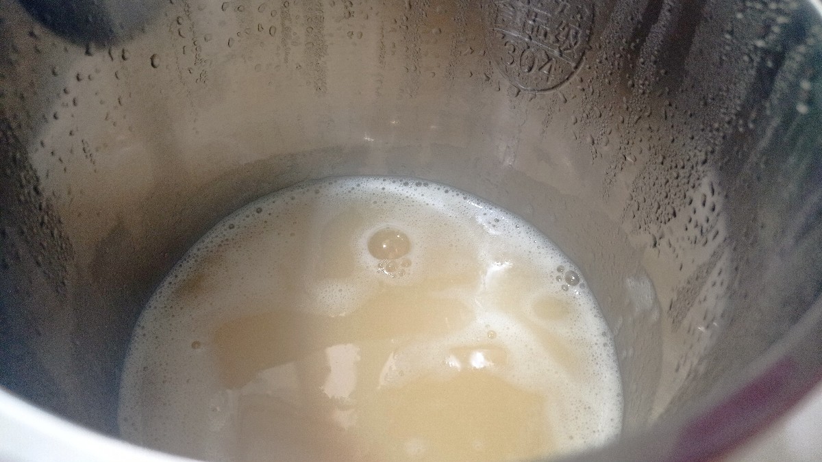 신기한 게 라면 포트처럼 생긴 깊은 스테인리스 통, 콩을 갈아주는 블랜더는 뚜껑에 달려있어요. 이 기기가 음식물을 끓이면서 블랜더로 갈고, 끓이고를 자동으로 반복하더라고요. 동봉된 작은 계량컵에 메주콩을 넣으니 95g쯤 되네요. 사용설명서에 마른 콩을 계량컵 1개에 물 1.1L-1.3L 넣고 작동하라고 쓰여있어서 하라는 대로 해봤습니다.
